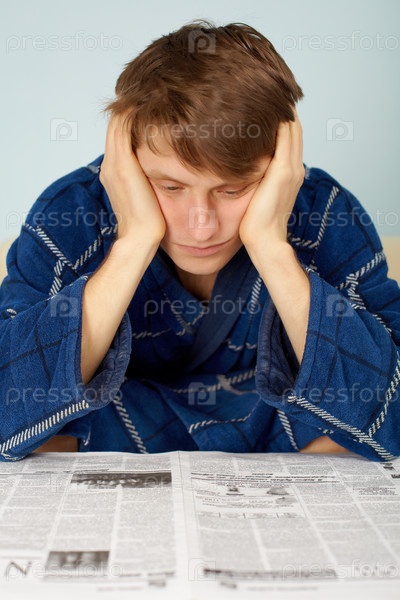Усталый молодой человек, читающий газету