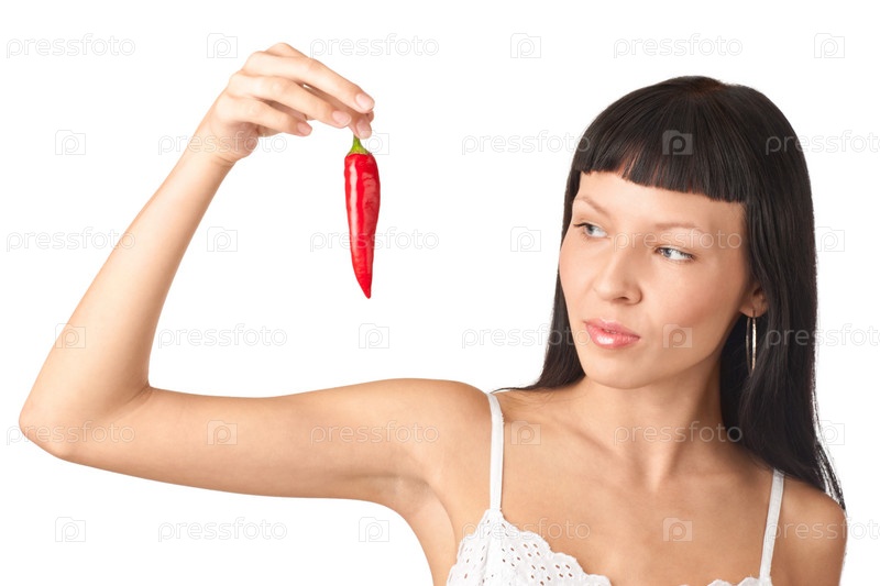 Красивая девушка с длинными темными волосами держит в руке красный перец чили, изолирована на белом
