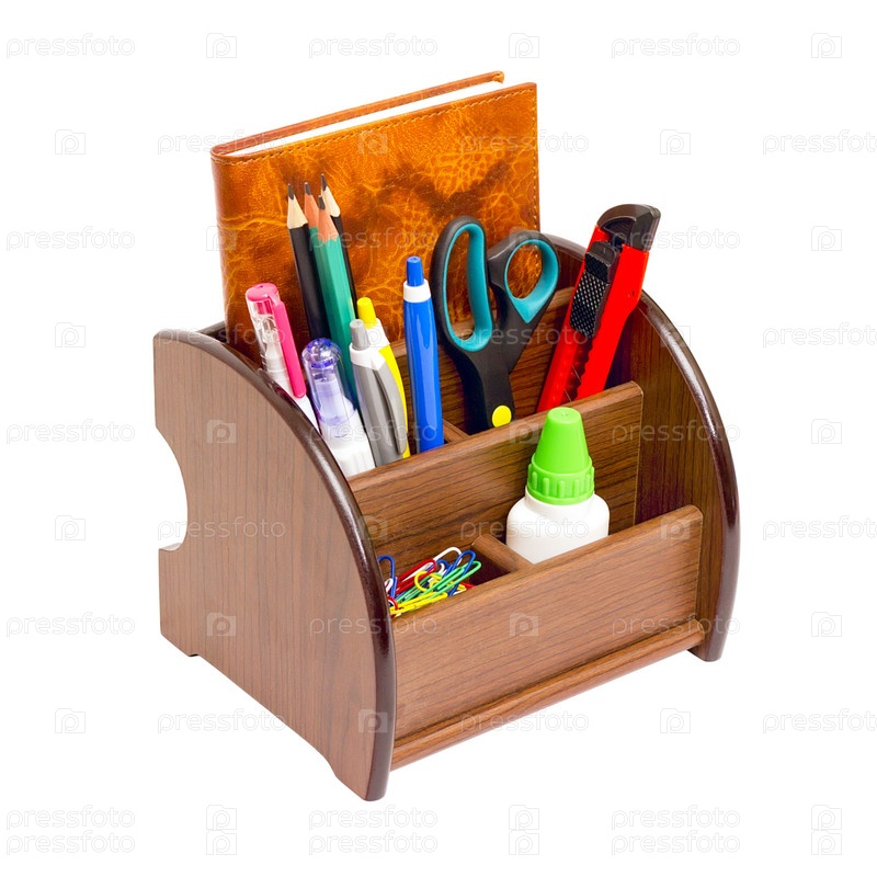 Деревянная подставка с канцелярскии принадлежностями, изолированная на белом фоне