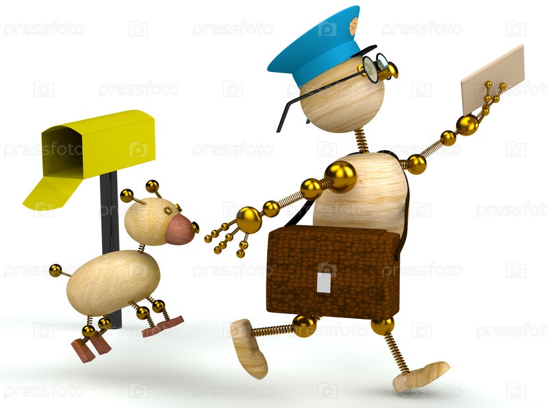 Деревянный почтальон с письмом и собакой у почтового ящика, изолированный на белом фоне