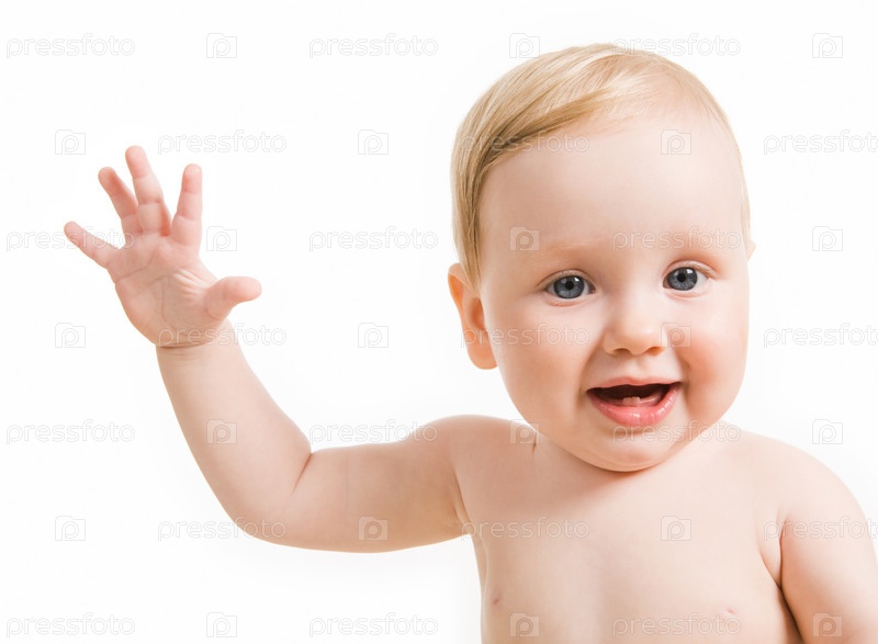 Портрет счастливого голубоглазого ребенка, смеющегося с поднятой рукой