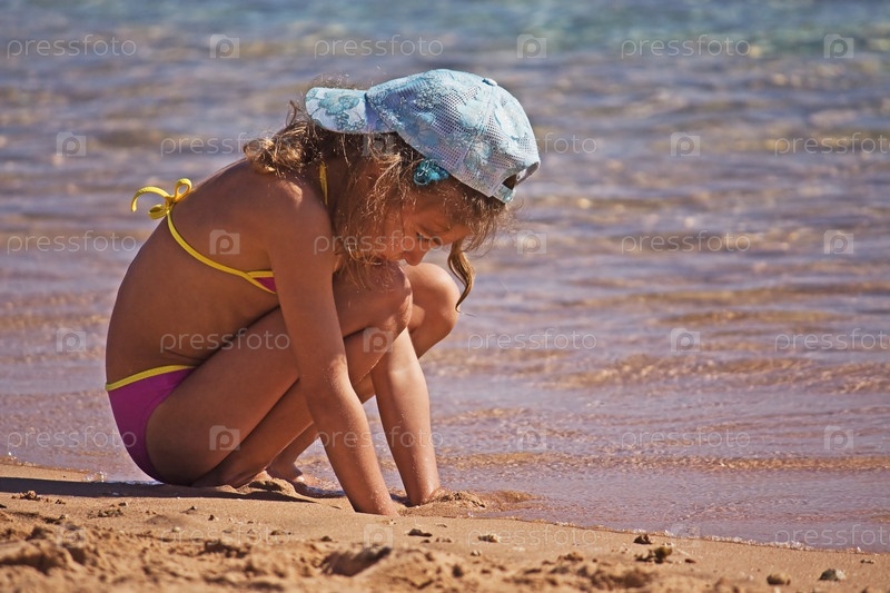 Маленькая девочка, сидящая на пляже и играющая в песок