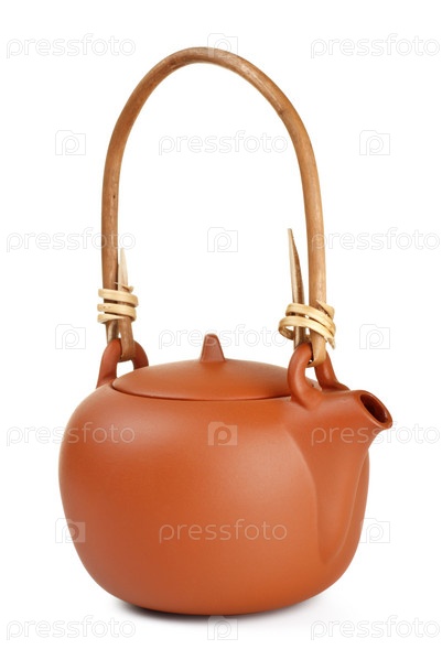 Китайский глиняный чайник на белом фоне крупным планом