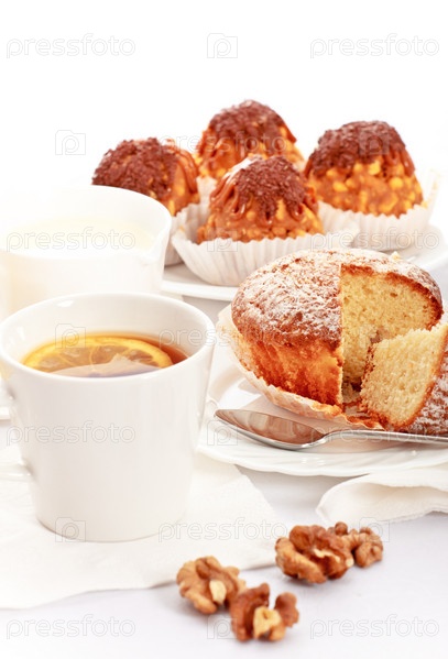 Горячий чай с лимоном и свежая выпечка крупным планом