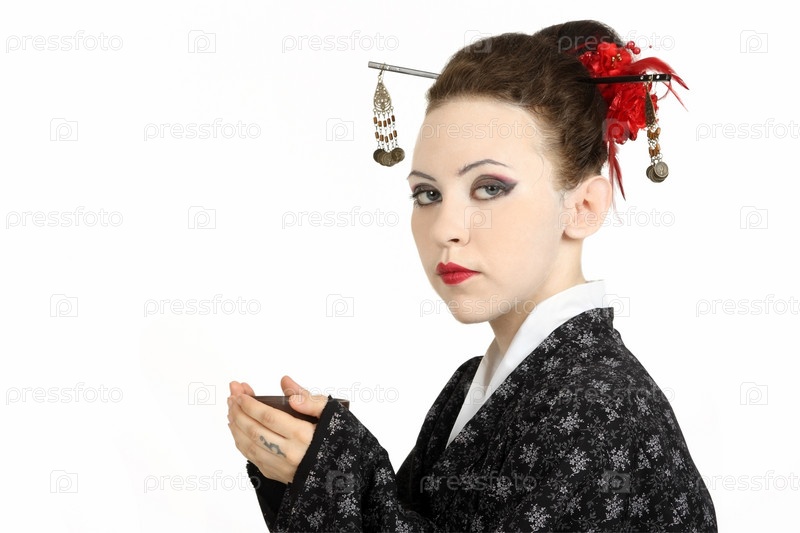 Японская гейша на белом фоне с вентилятором и зонтиком