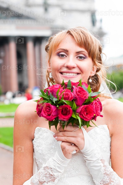 Счастливая невеста держит свадебный букет