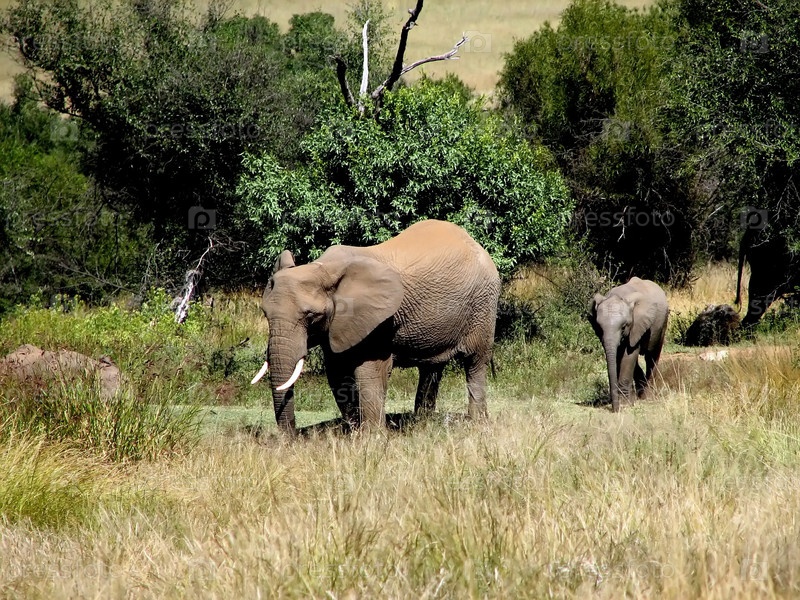 Слоновая корова и маленький слон вблизи саванны на солнечный день