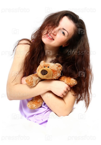 Портрет молодой девушки с игрушечным медвежонком на белом фоне