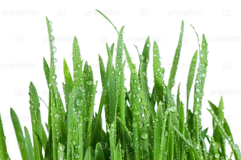 Зеленая трава с каплями росы, изолированная на белом фоне
