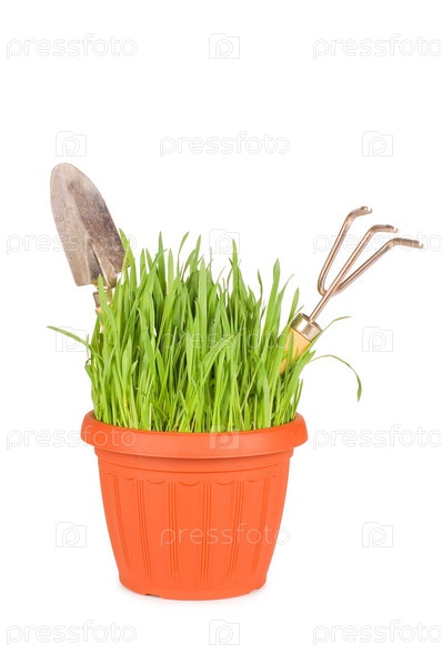 Горшочек с зеленой травой и садовыми инструментами, изолированный на белом фоне