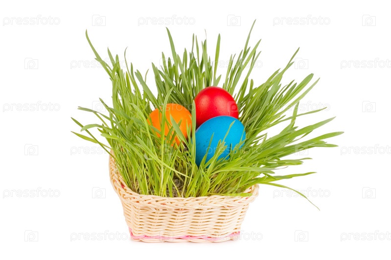 Корзинка с зеленой травой и пасхальными яйцами, изолированная на белом фоне