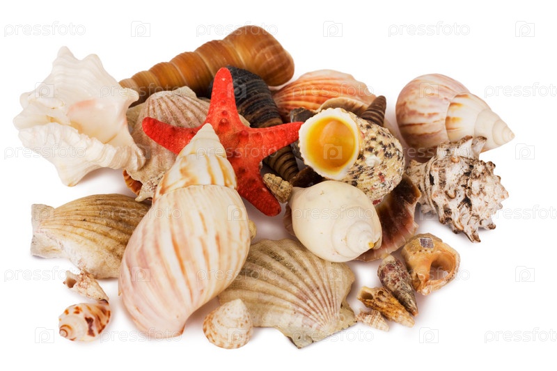 Морская звезда и ракушки на белом фоне