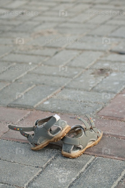 Серые детские сандали на тротуаре