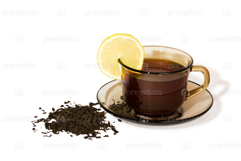 Чашка чая с лимоном и сухая заварка на белом фоне