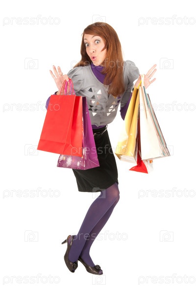 Удивленная девушка с пакетами на белом фоне