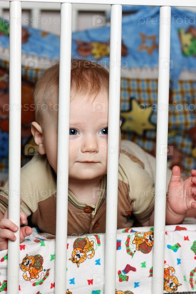 Симпатичный ребенок смотрит через решетку детской кроватки