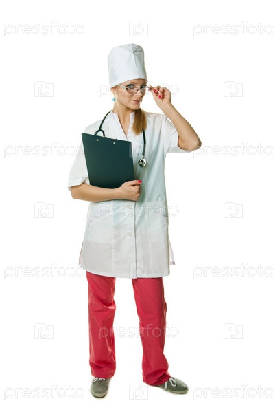 Молодая девушка-врач на белом фоне