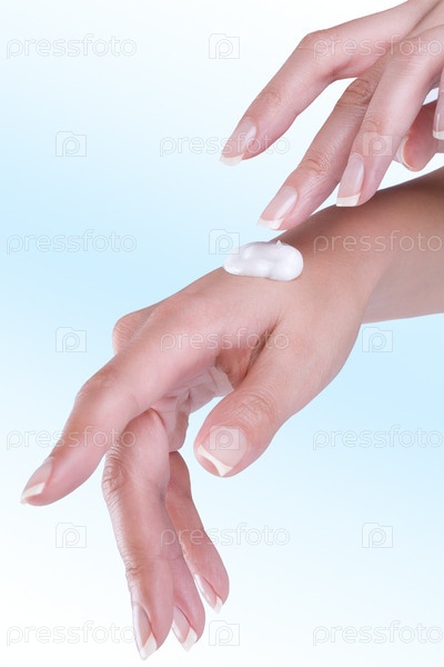 Женщина наносит крем для рук, крупный план на голубом фоне