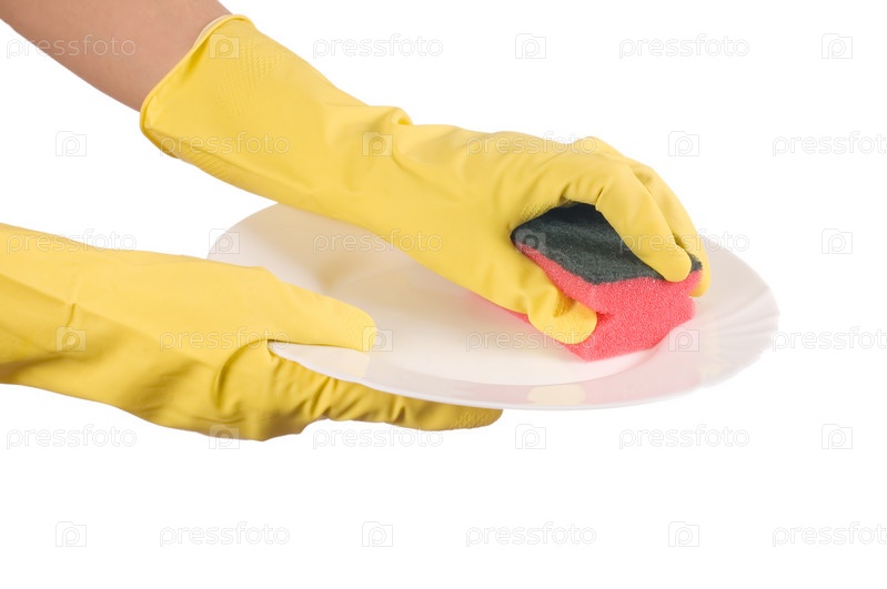 Руки в резиновых перчатках моют тарелку с помощью губки