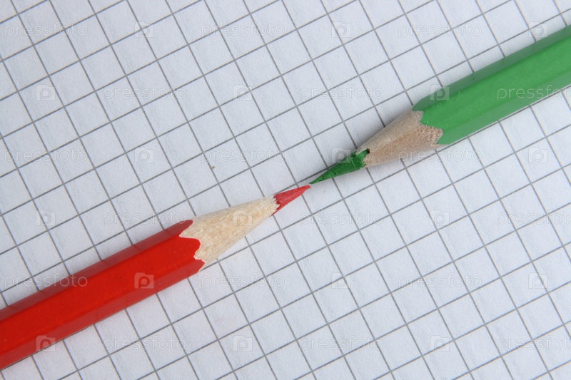 Красный и зеленый карандаши на клетчатой бумаге