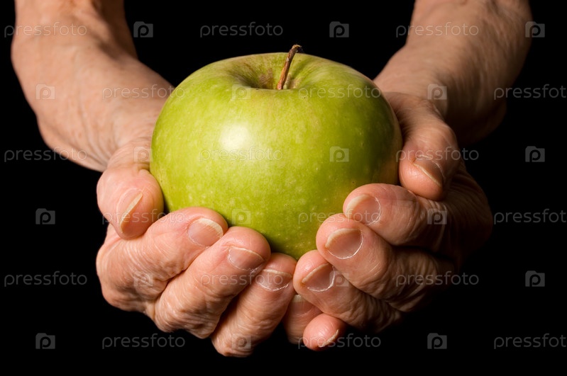 Руки пожилого человека, держащие яблоко на черном фоне