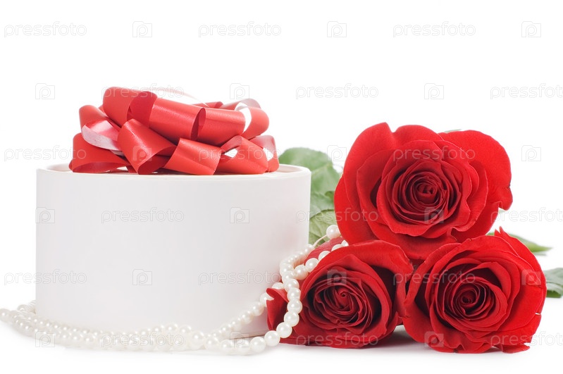 Букет красных роз, лежащий рядом с подарочной коробкой