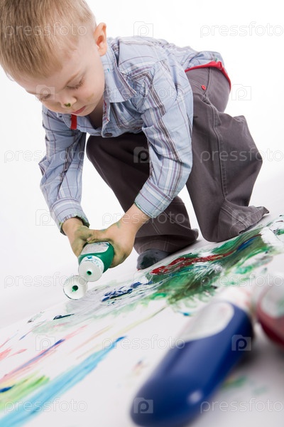 Фото симпатичного парня, рисующего что-то цветным гуашем