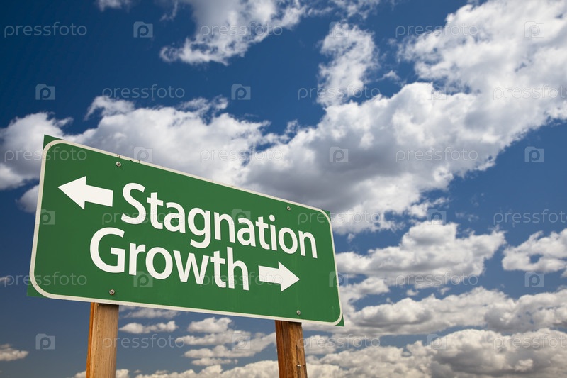 Стагнация или рост. Зеленый дорожный знак на фоне облачного неба
