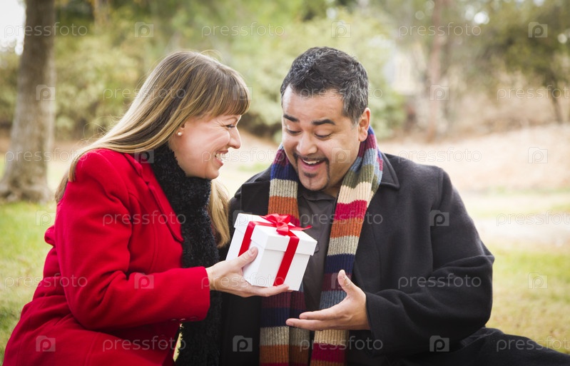 Пара обменивается подарками на свежем фоздухе