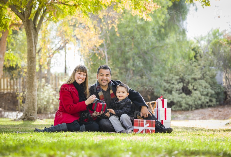 Семья обменивается рождественскими подарками в парке