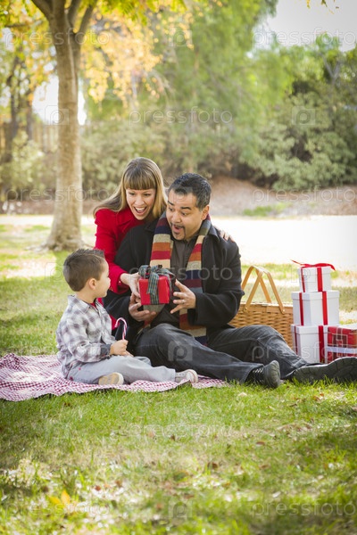 Семья обменивается рождественскими подарками в парке