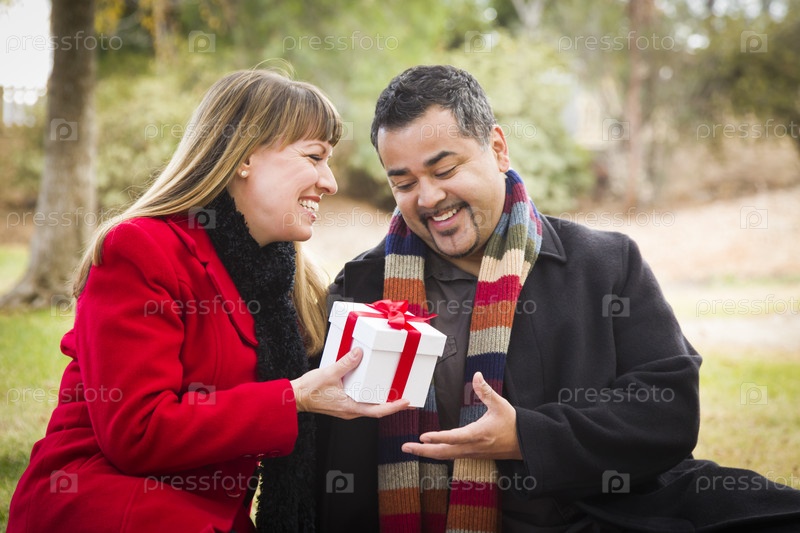 Пара обменивается подарками на свежем фоздухе