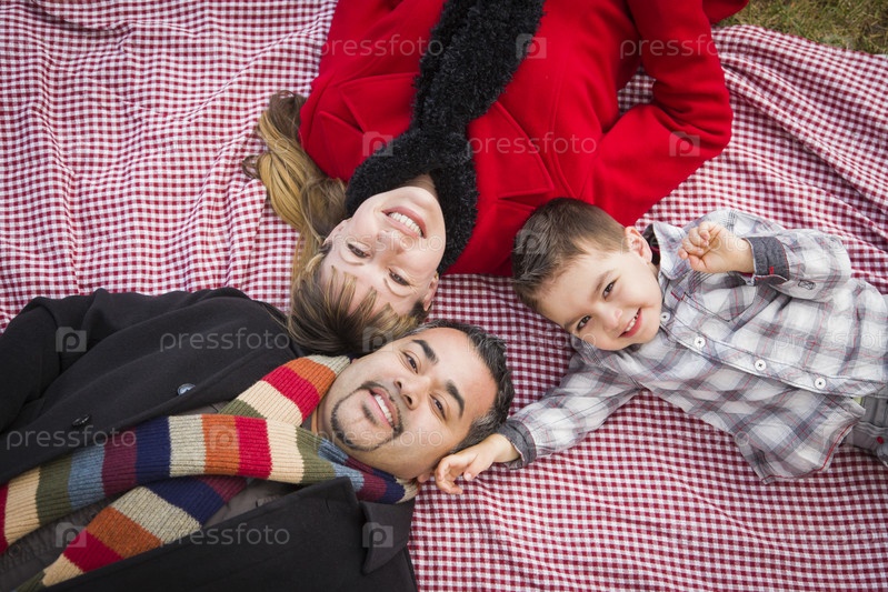 Семья в зимней одежде лежит в парке