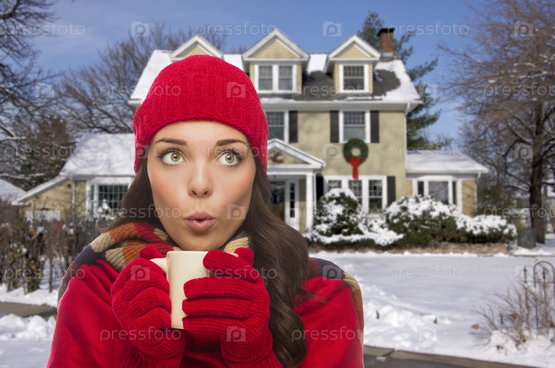 Улыбающаяся женщина в зимней одежде с кружкой на заснеженной улице