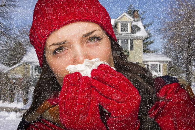 Больная женщина сморкается в платок на зимней улице