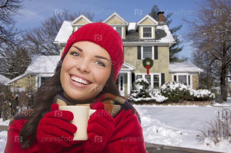 Улыбающаяся женщина в зимней одежде с кружкой на заснеженной улице