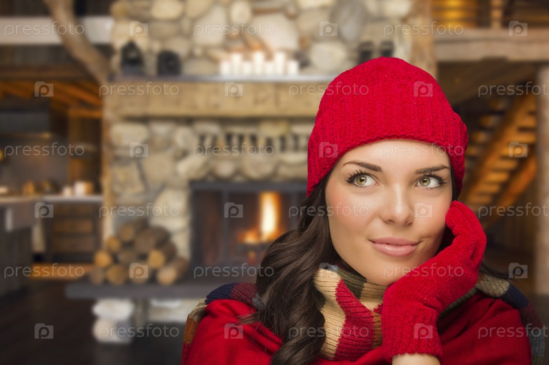 Девушка наслаждается теплом камина в деревенском доме