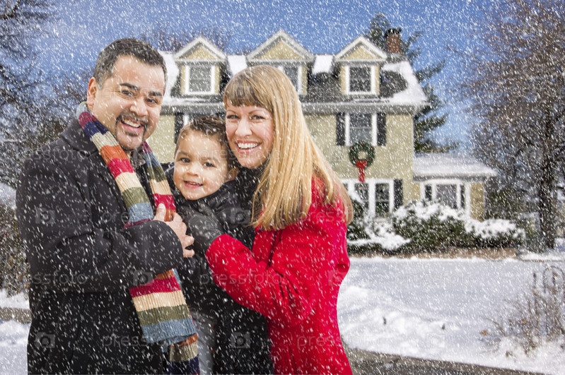Семьи возле дома в снежную погоду