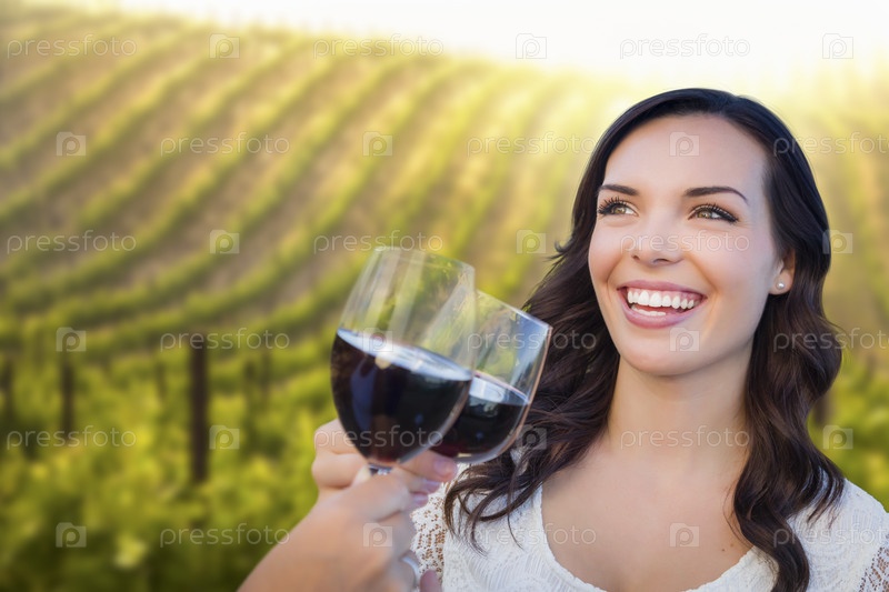 Привлекательная женщина наслаждается бокалом вина на винограднике