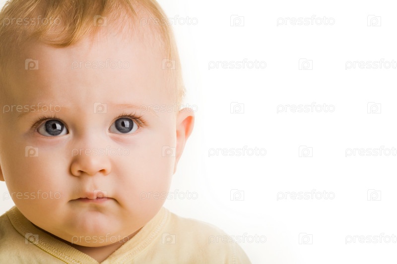 Лицо очаровательного ребенка, который серьезно смотрит на камеру над белым фоном