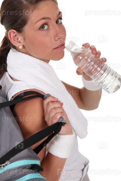 Женщина пьет воду после спортивной тренировки