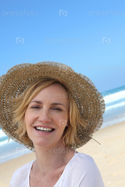Улыбающаяся женщина в соломенной шляпе на пляже