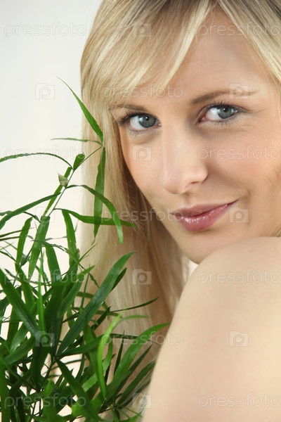 Портрет блондинки с листом зеленого растения