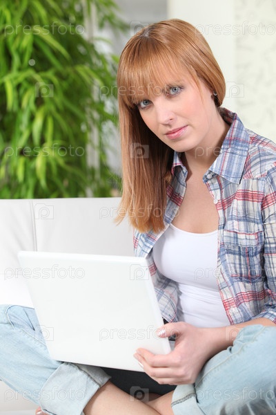 Женщина, сидящая с ноутбуком в помещении