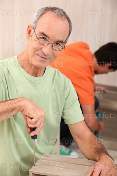 Пожилой мужчина собирает шкаф