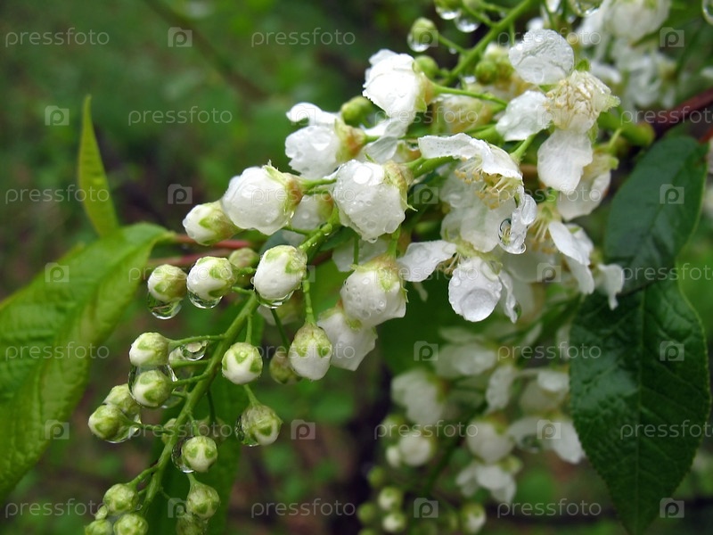 Цветы черемухи в каплях дождя