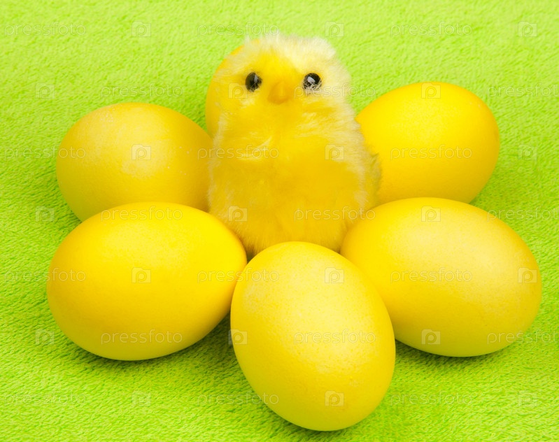 Цыпленок среди желтых пасхальных яиц крупным планом