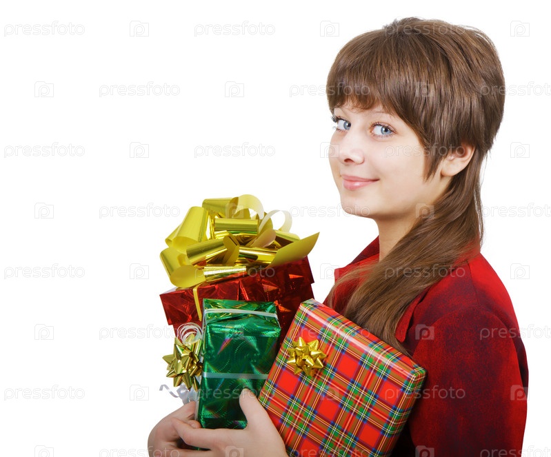 Портрет привлекательной молодой женщины с подарками на белом фоне