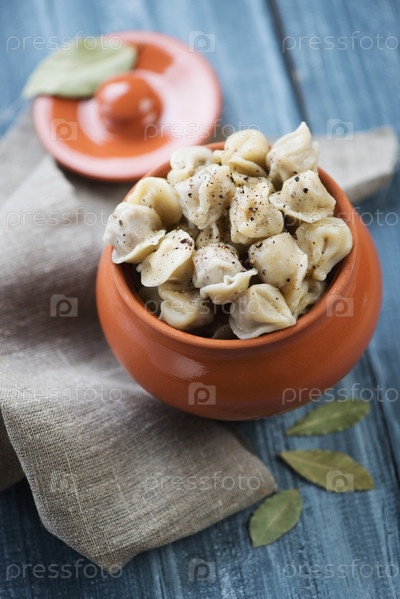 Горшок вареных пельменей с черным перцем и лавровым листом