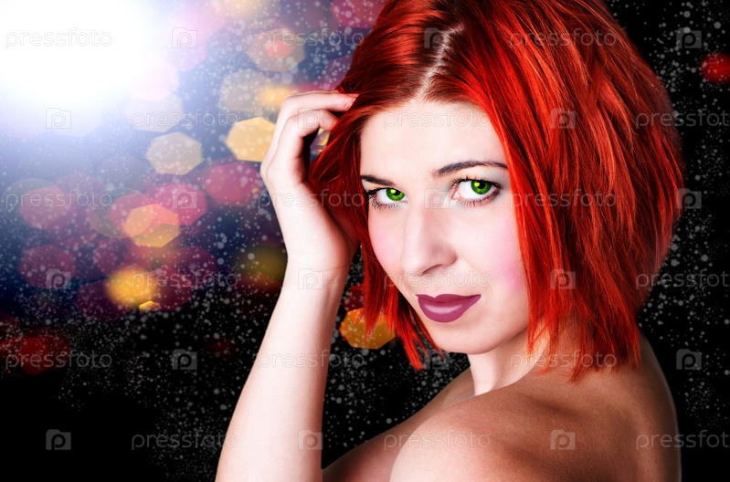 Красивая девушка-модель с рыжими волосами на праздничном абстрактном фоне